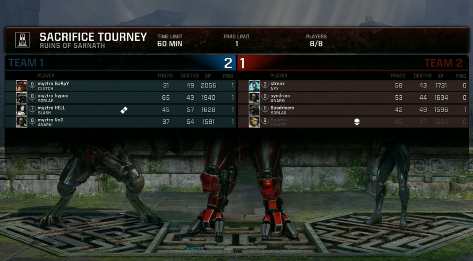 After losing to NOTOFAST and dropping down to the loser bracket, a nail biting bout against Miasma! (dem0n, ddk, Juven1le, Lithz) awaited. The last matchup of the EU Regional finals and our last chance to qualify for the grand finals at QuakeCon. After a very closely fought contest between the two teams, Myztro flipped the switch in the last couple of rounds which secured our road to QuakeCon. Any sceptics that don’t think Quake Champions Sacrifice Mode is a fun to watch need only view this matchup.